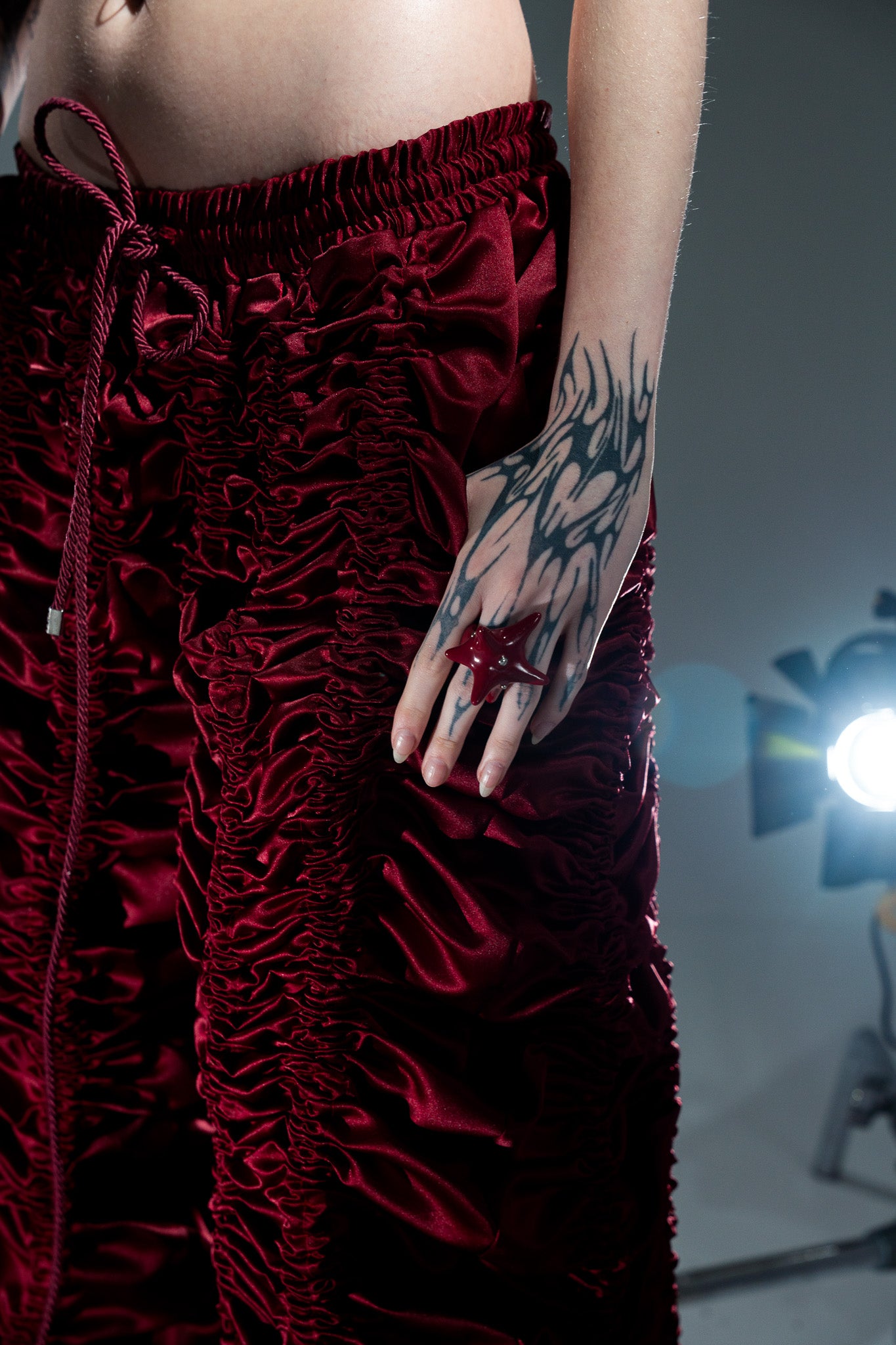 The Wine Ruched Pants embody MENASCHE’s signature silhouette in a deep, bold wine tone — a color that balances elegance with intensity. Designed with our innovative adjustable ruched mechanism, the pants allow you to customize both length and width, creating a sculptural fit that adapts to your body and style.